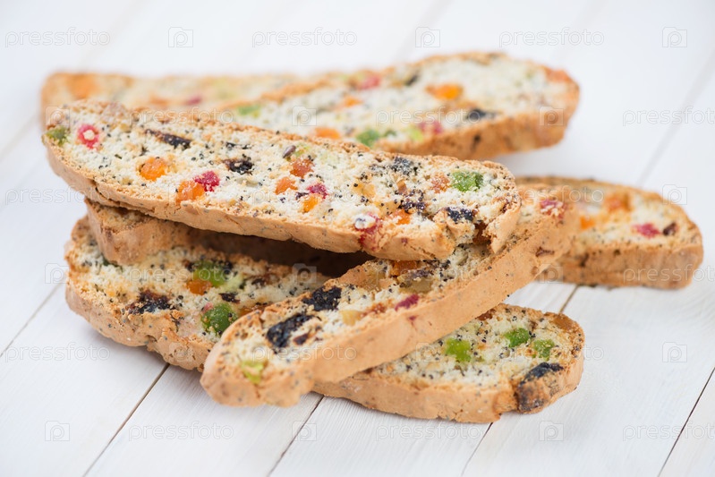 Стопка свежих итальянских бискотти с маком, цукатами и черносливом