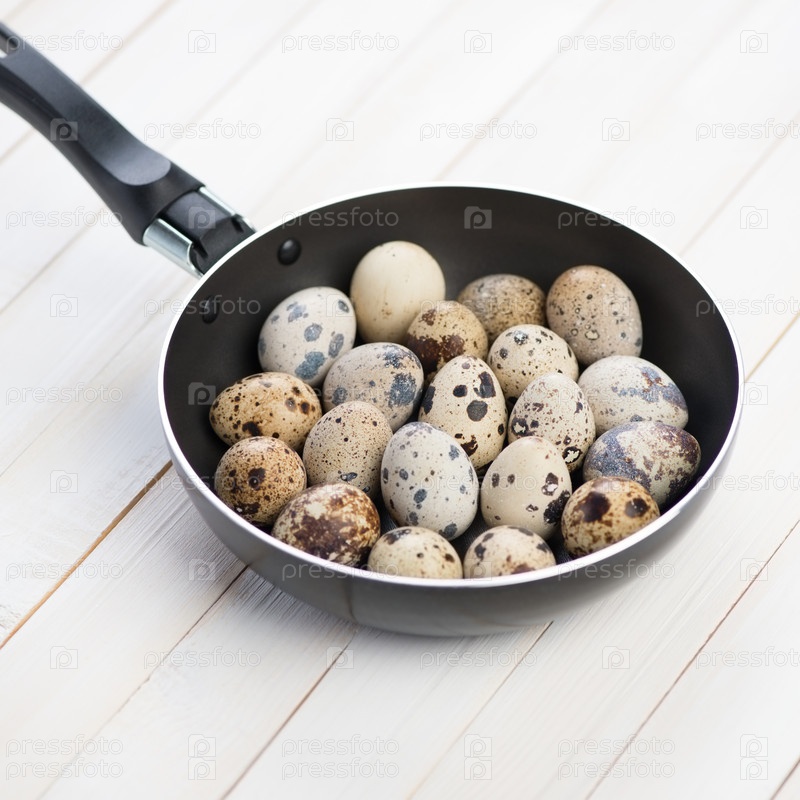 Сковорода с сырыми перепелиными яйцами, студия