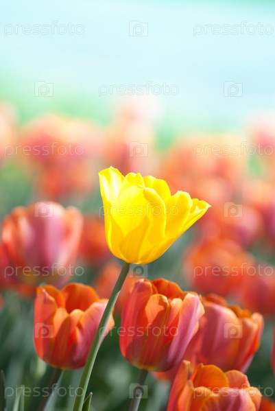 Желтый тюльпан в окружении красных тюльпанов