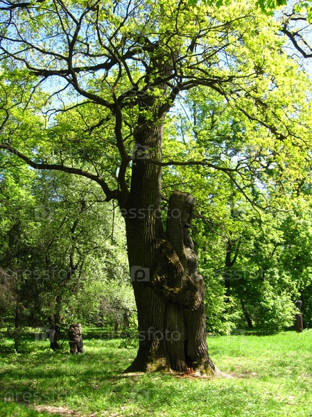 Огромный старый дуб с деревянной скульптурой на стволе
