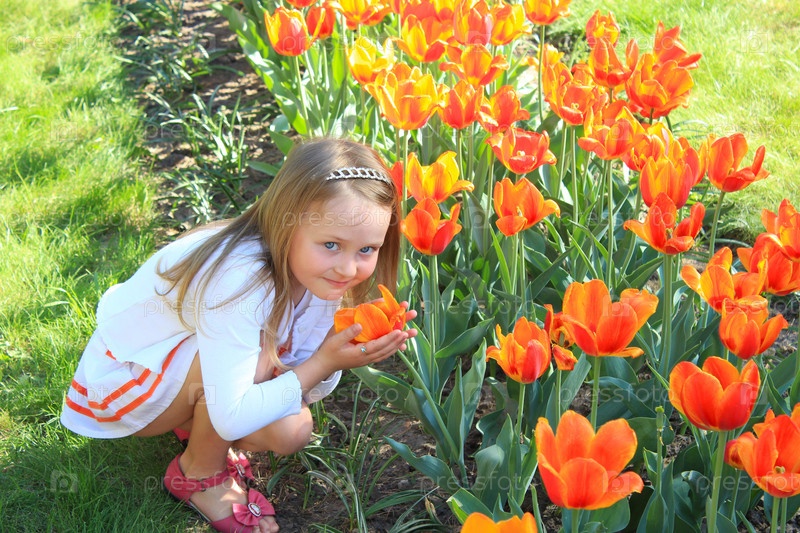 Девочка нюхает тюльпаны на клумбе