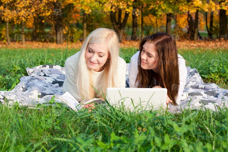 Две студентки учатся в осеннем парке