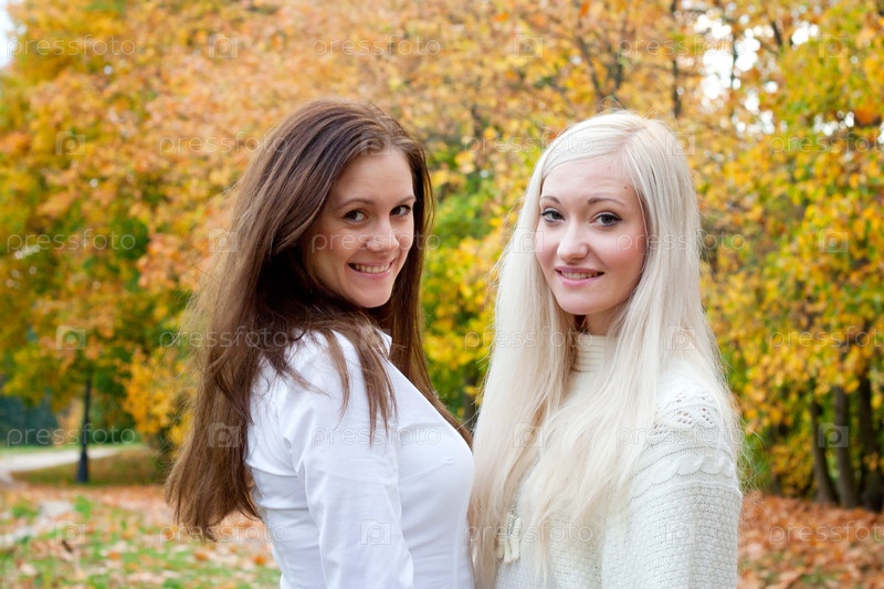 Две красивые девушки на фоне осеннего пейзажа