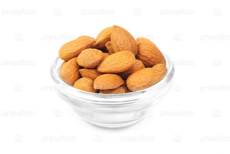 Сушеный миндаль в стеклянной миске, изолированный на белом фоне