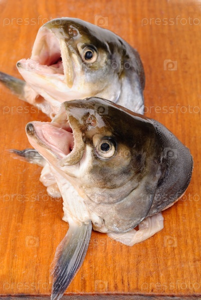 Головы лосося на разделочной доске, изолированной на белом фоне