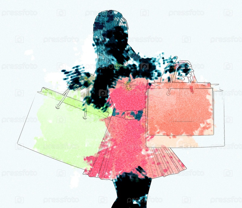 Акварельный силуэт девушки с покупками