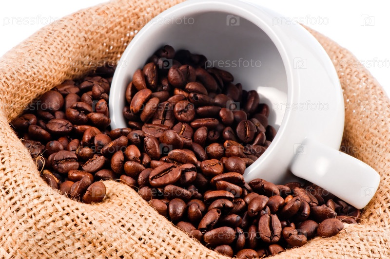 Белая чашка в мешке кофейных зерен