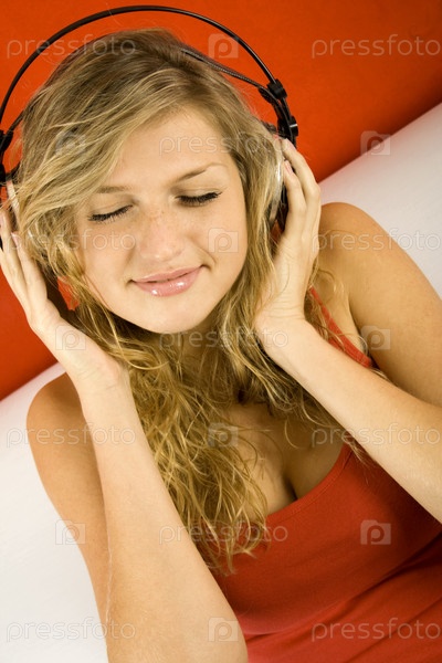 Блондинка в наушниках на оранжевом фоне