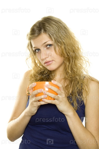 Блондинка с кружкой в руках на белом фоне