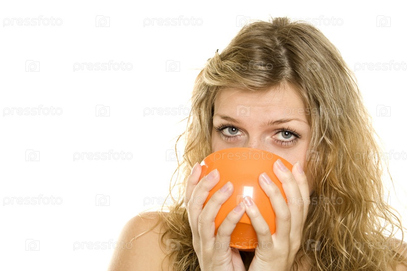 Блондинка пьет из чашки на белом фоне