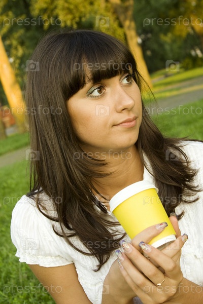 Брюнетка с бумажным стаканчиком на открытом воздухе