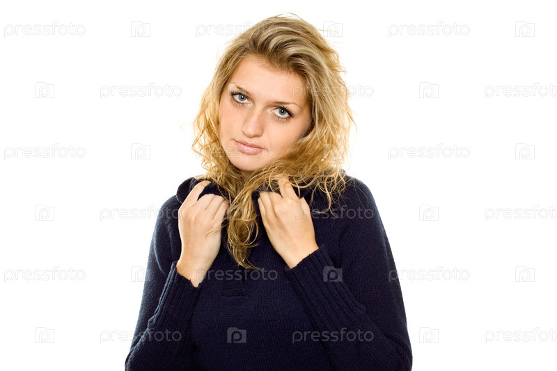 Блондинка в синем свитере на белом фоне