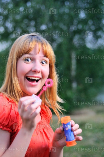 Девушка надувает мыльные пузыри