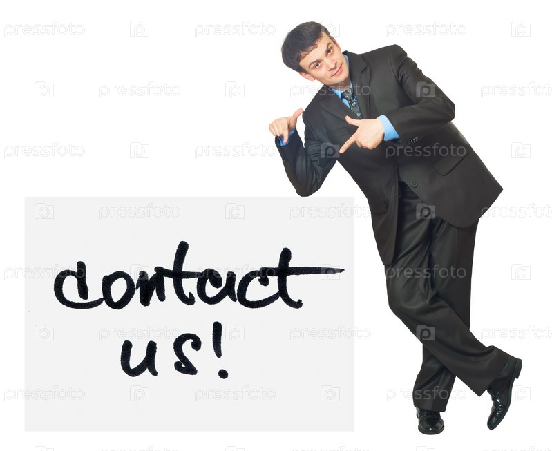 Молодой бизнесмен с сообщением "свяжитесь с нами" на белом фоне