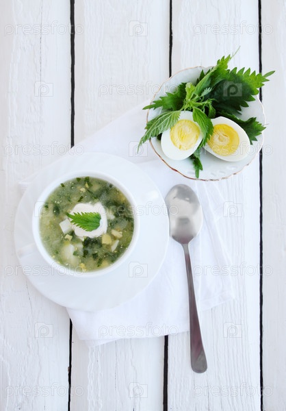 Зеленый борщ с крапивой, щавелем и вареными яйцами