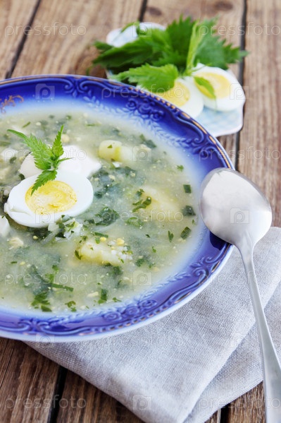Зеленый борщ с крапивой, щавелем и вареными яйцами