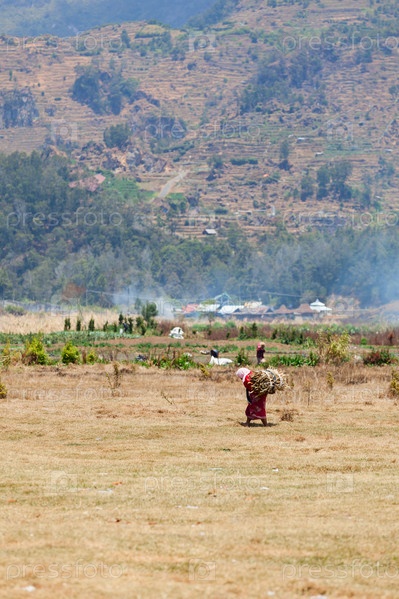 Пожилая женщина, работающая на ферме, несет дрова