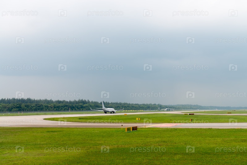 Самолет разгоняется на взлетно-посадочной полосе аэропорта