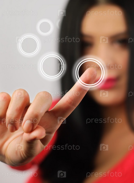 Заинтересованная девушка нажимает кнопки сенсорного экрана