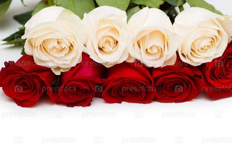 Красные и белые розы на белом фоне