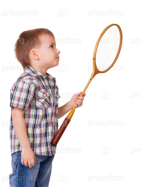 Мальчик с ракеткой для игры в юадминтон на белом фоне
