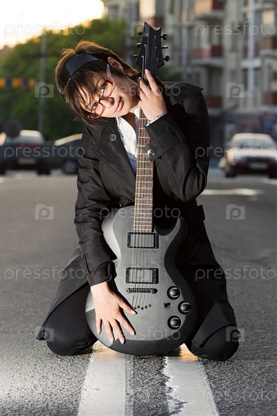 Молодая женщина с гитарой на улице