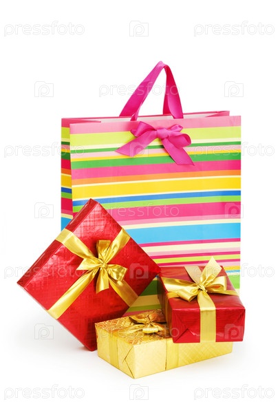Полосатый подарочный пакет с коробками, изолированные на белом фоне