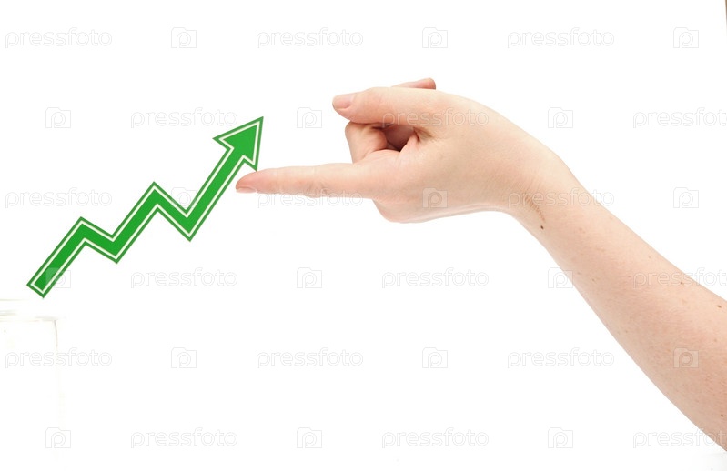Рука держит стрелку графика на белом фоне. Финансовый успех