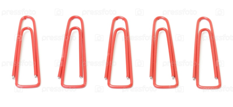 Красные скрепки крупным планом на белом фоне