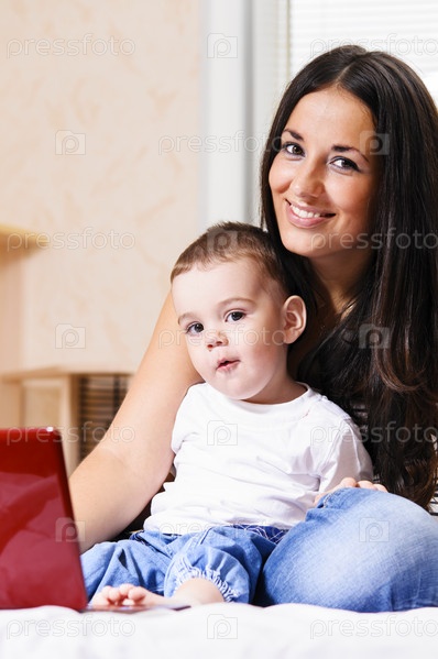Мать и сын используют ноутбук