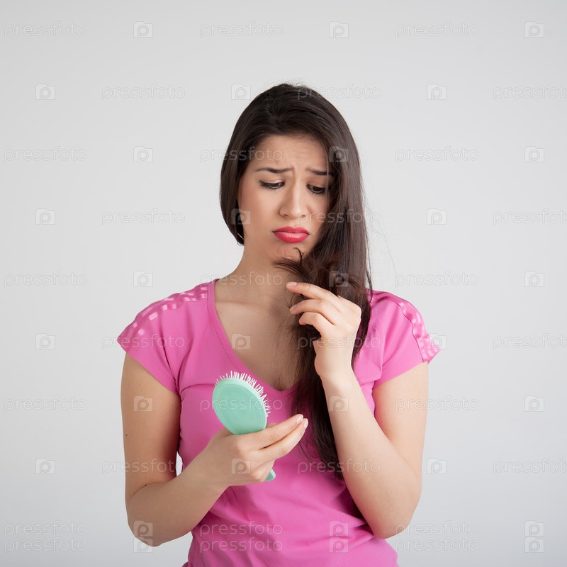 Шокированная женщина с выпавшими волосами на расческе