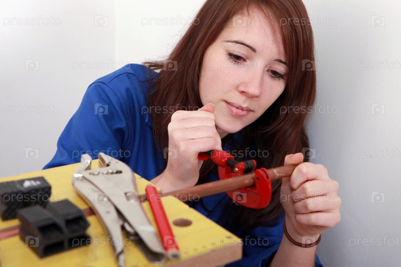 Рыжеволосая девушка работает сантехником