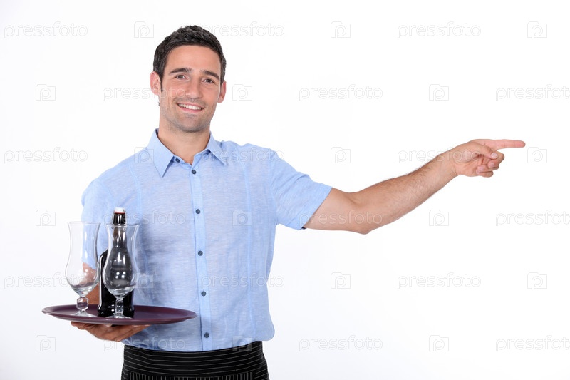 Официант с бутылкой на подносе
