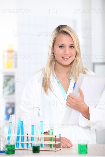 Молодой студент с пробирками и записями