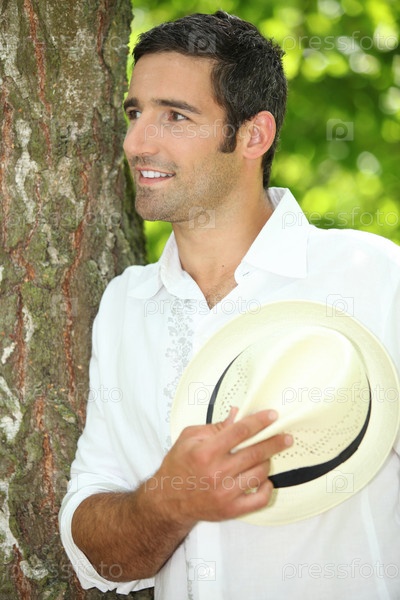 Мужчина с соломенной шляпой стоит, прислонившись к дереву