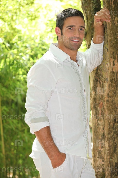 Мужчина стоит, прислонившись к дереву