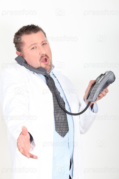 Доктор, предлагает рукопожатие, разговаривая по телефону