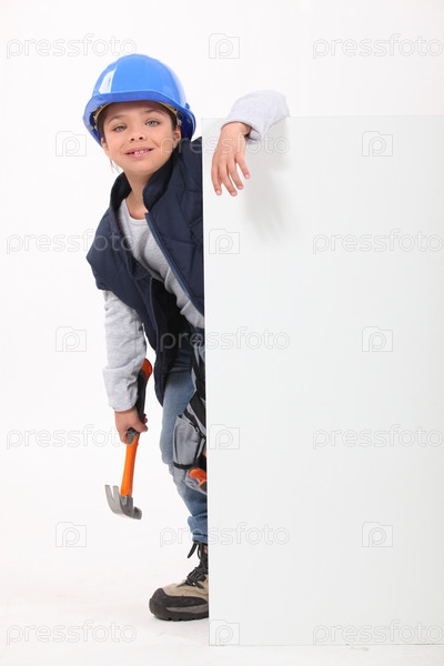 Маленькая девочка одетая как строитель с плакатом
