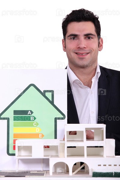 Архитектор позирует возле модели дома с рейтингом потребления энергии