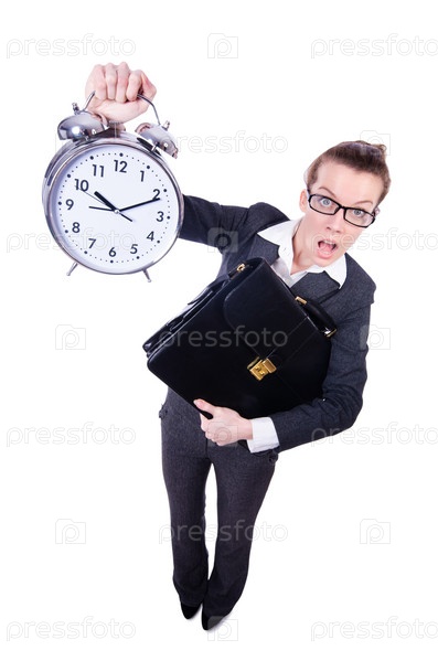 Смешная женщина с часами на белом фоне