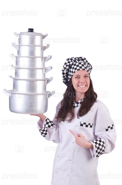 Повар со стопкой кастрюль на белом фоне