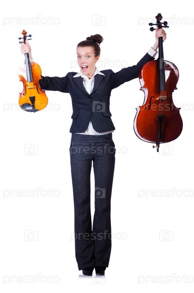 Бизнес-леди с виолончелью, изолированная на белом фоне