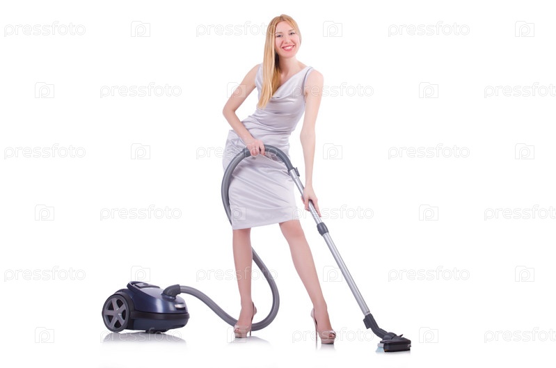 Молодая женщина с пылесосом на белом фоне