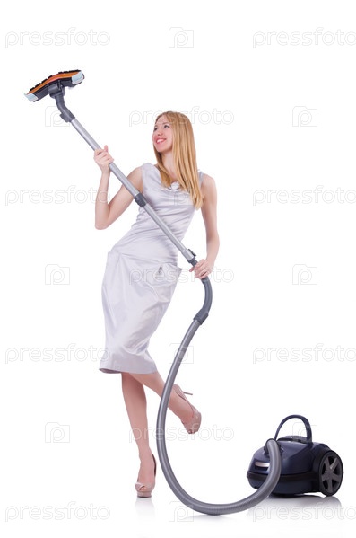 Молодая женщина с пылесосом на белом фоне