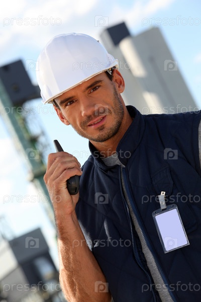 Портрет прораба с рацией на строительной площадке