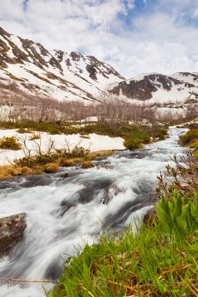 Заснеженные Кавказские горы над движущимся размытым потоком вблизи Архыза