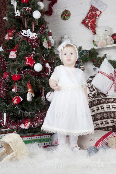 Девочка стоит у новогодней елки