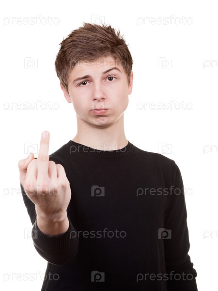 Хмурый подросток показывает средний палец, изолированный на белом фоне
