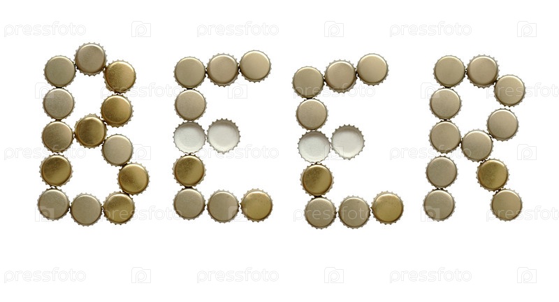 Слово 'пиво' из крышек бутылок на белом фоне