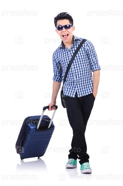 Молодой парень с чемоданом на белом
